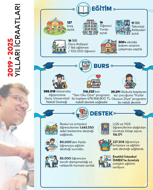388 bin 18 üniversite öğrencisine nakdi destek, ‘Sen oku diye’ programı kapsamında 478 milyon 968 bin lira destek ve 39 bin 291 kız çocuğuna nakdi destek ile beraber LGS ve YGS öğrencilerine 116 bin ücretsiz kitap, 227 bin 308 öğrenciye kırtasiye eğitimi verildiğini kaydeden İmamoğlu notunu da şu şekilde yazdı: