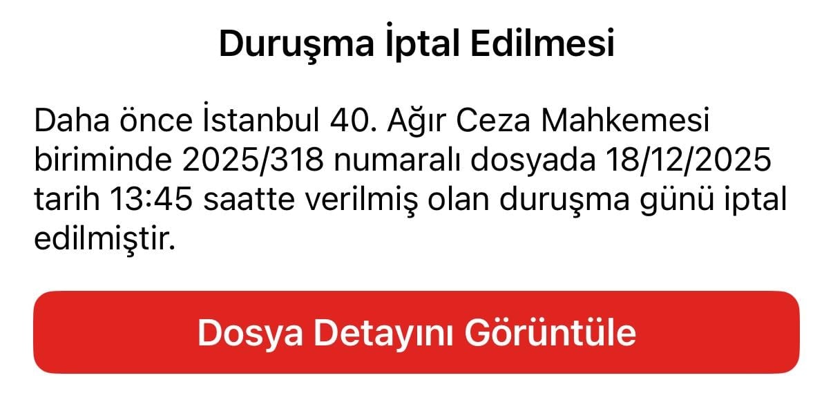 Ancak birkaç dakika sonra “duruşma iptal edilmesi” başlıklı bir bildiriyle o tarihte verilen 2025/318 sayılı İBB davasının 18.12.2025 tarihinde iptal edilen bir bildiri yayımlandı.
