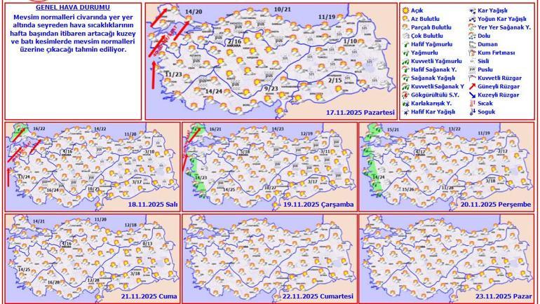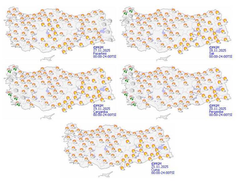 Meteoroloji Genel Müdürlüğü tarafından yapılan tahminlere göre: Ülkemizin kuzey, iç ve doğu kesimlerinin parçalı ve çok bulutlu, Doğu Karadeniz, Doğu Anadolu, Güneydoğu Anadolu’nun doğusu ile Kayseri ve Şanlıurfa çevrelerinin yağışlı, diğer yerlerin az bulutlu ve açık geçeceği tahmin ediliyor. Yağışların, genellikle yağmur ve sağanak, Doğu Karadeniz’in iç kesimlerinin yüksekleri ile Doğu Anadolu’nun kuzey ve doğusunun yükseklerinde karla karışık yağmur ve yer yer kar şeklinde olması bekleniyor. Yağışların, Bitlis, Muş, Siirt, Şırnak ve Hakkari çevreleri ile Van’ın güneybatı kesimlerinde yer yer kuvvetli olacağı tahmin ediliyor. Sabah ve gece saatlerinde Marmara, İç Ege, Batı Akdeniz’in iç kesimleri, İç Anadolu’nun kuzeybatısı ile Batı ve Orta Karadeniz’in iç kesimlerinde yer yer pus ve sis bekleniyor.